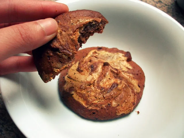 Inspired by this super-fast and super-easy recipe of 'a teeming mind', I just had to try these Chocolate-Chia-Seed Cookies! I adjusted it to my preferences and the ingredients I've got at hand, so this turned out as some super-chocolaty Chocolate-Chia-Seed Cookies with a Peanutbutter swirl!!! :) I really like this recipe because you can have four big cookies right away, try it and let me know how you like it ;-)